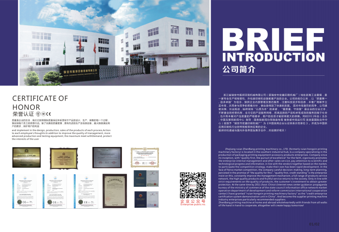 瑞安市振邦印刷機(jī)械有限公司地處浙南工業(yè)重鎮(zhèn),是一家專業(yè)生產(chǎn)外包裝印刷機(jī)設(shè)備及配套產(chǎn)品的企業(yè),主要產(chǎn)品有:柔版印刷機(jī)、模切機(jī)、檢標(biāo)機(jī)、復(fù)卷品檢機(jī)、紙吸管機(jī)、分切機(jī)系列不干膠印刷設(shè)備等;是中國印刷技術(shù)協(xié)會會員單位。